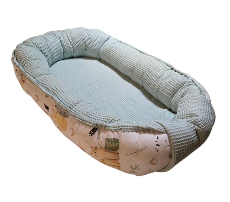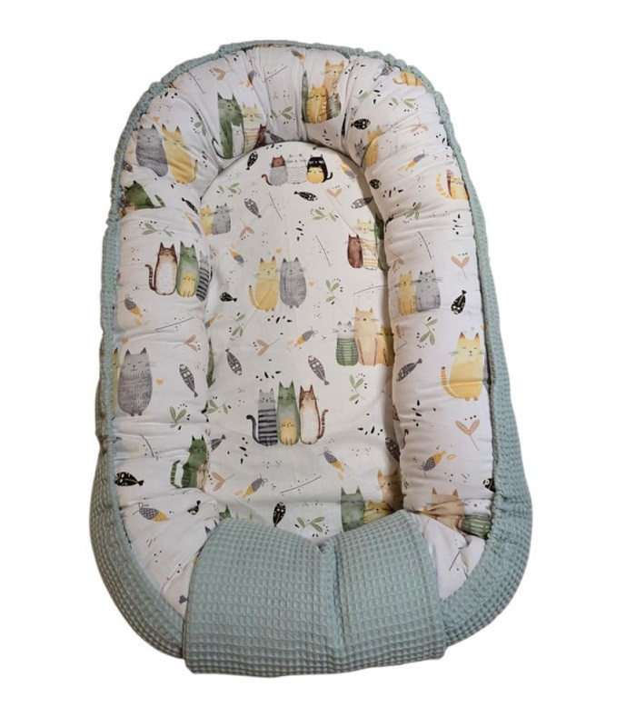 A babafészek waffle pamutból készült, belső oldalán pedig finom tapintású, cica mintás pamutvászon teszi igazán különlegessé.