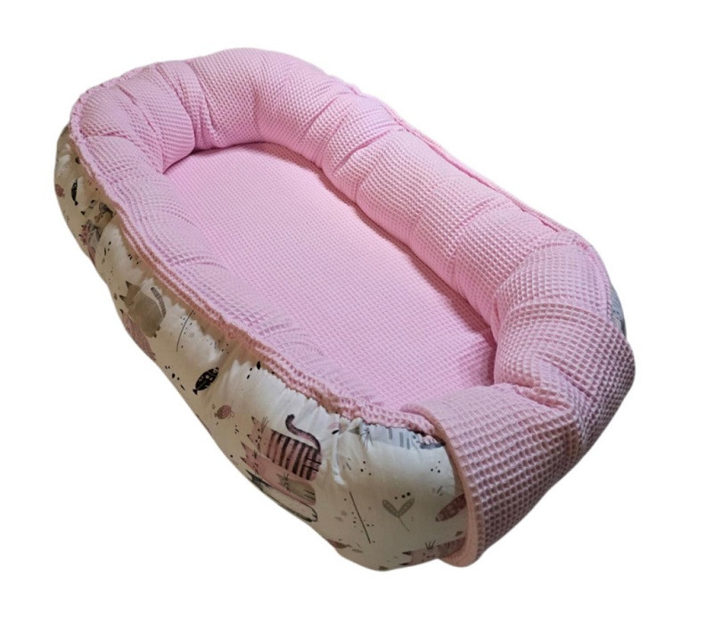 A babafészek waffle pamutból készült, belső oldalán pedig finom tapintású, cica mintás pamutvászon teszi igazán különlegessé.